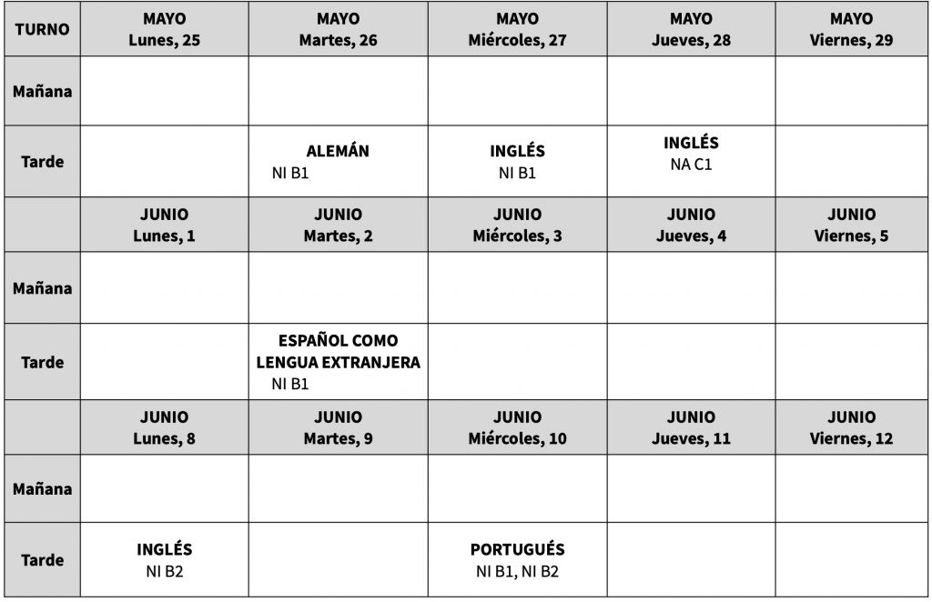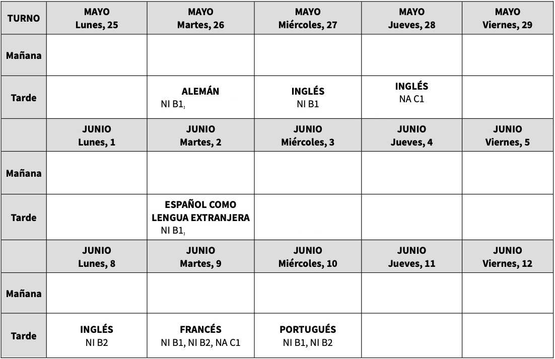 El calendario de exámenes que publicamos a continuación se refiere únicamente a la fecha de realización de las pruebas de comprensión de textos escritos, comprensión de textos orales, producción y coproducción de textos escritos, y mediación escrita.